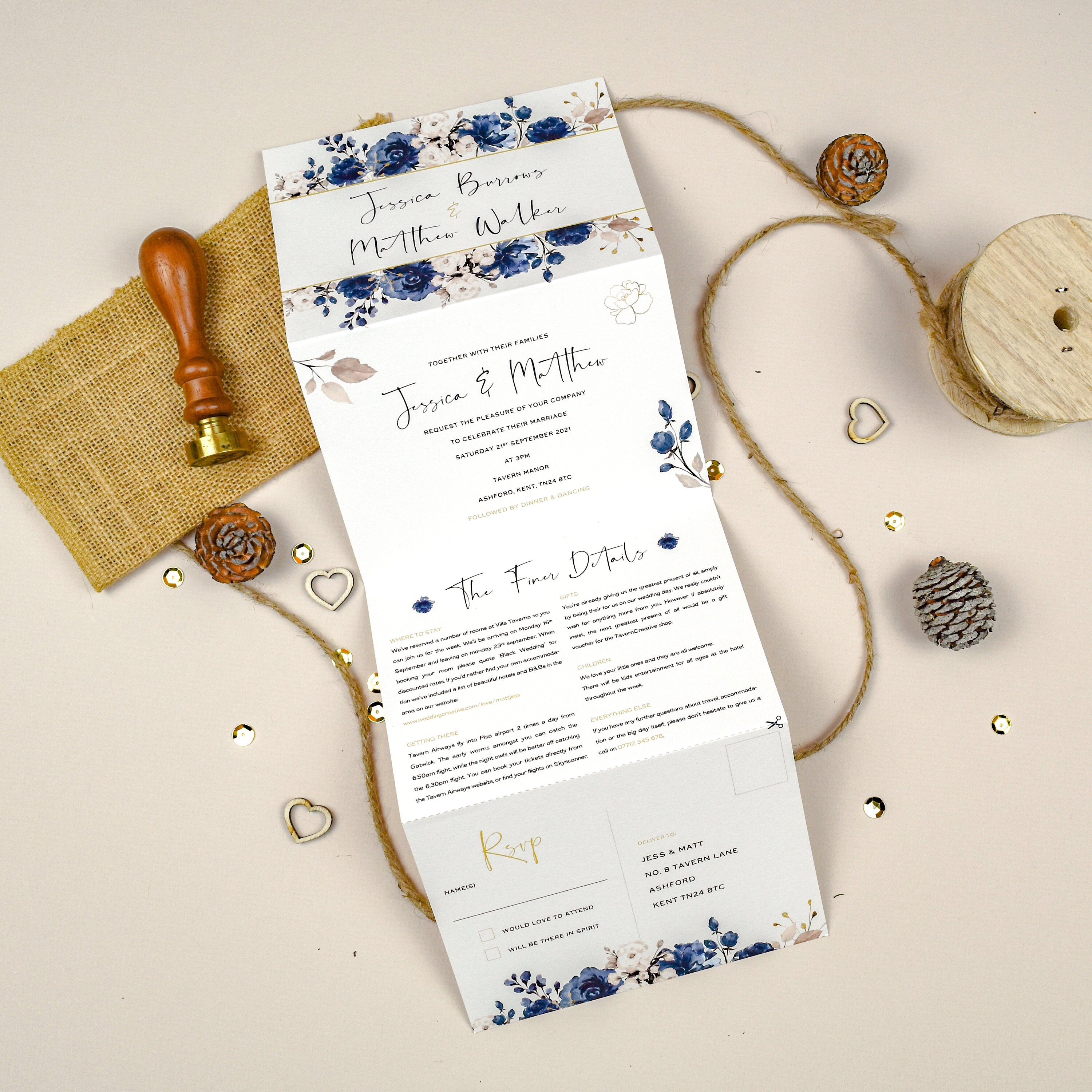 Folded Wedding Invitation Blue Floral Wedding Invitation Wedding Invite Blue Concertina Wedding Invites Tri Fold Invitation Rustic