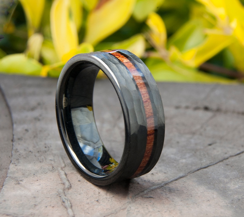 Black Hammered Tungsten Ring Wood Inlay Wedding Band Mens 8mm Comfort Fit Design Size 5 To 15 Male Unique Fashion Anniversary Love Gift