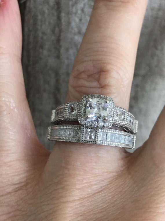 2 5ct Princess Simulated Diamond Wedding Band Set 2pc Halo Wedding Set 925 Sterling Silver Engagement Ring Wedding Rings Women S