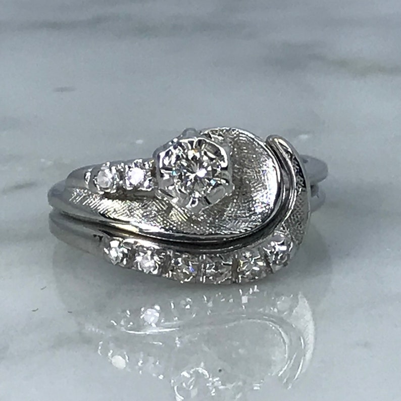 Vintage Wedding Ring Set Diamond Engagement Ring Diamond Wedding Band 0 24 Carats 14k White Gold Setting Estate Jewelry Bridal Set