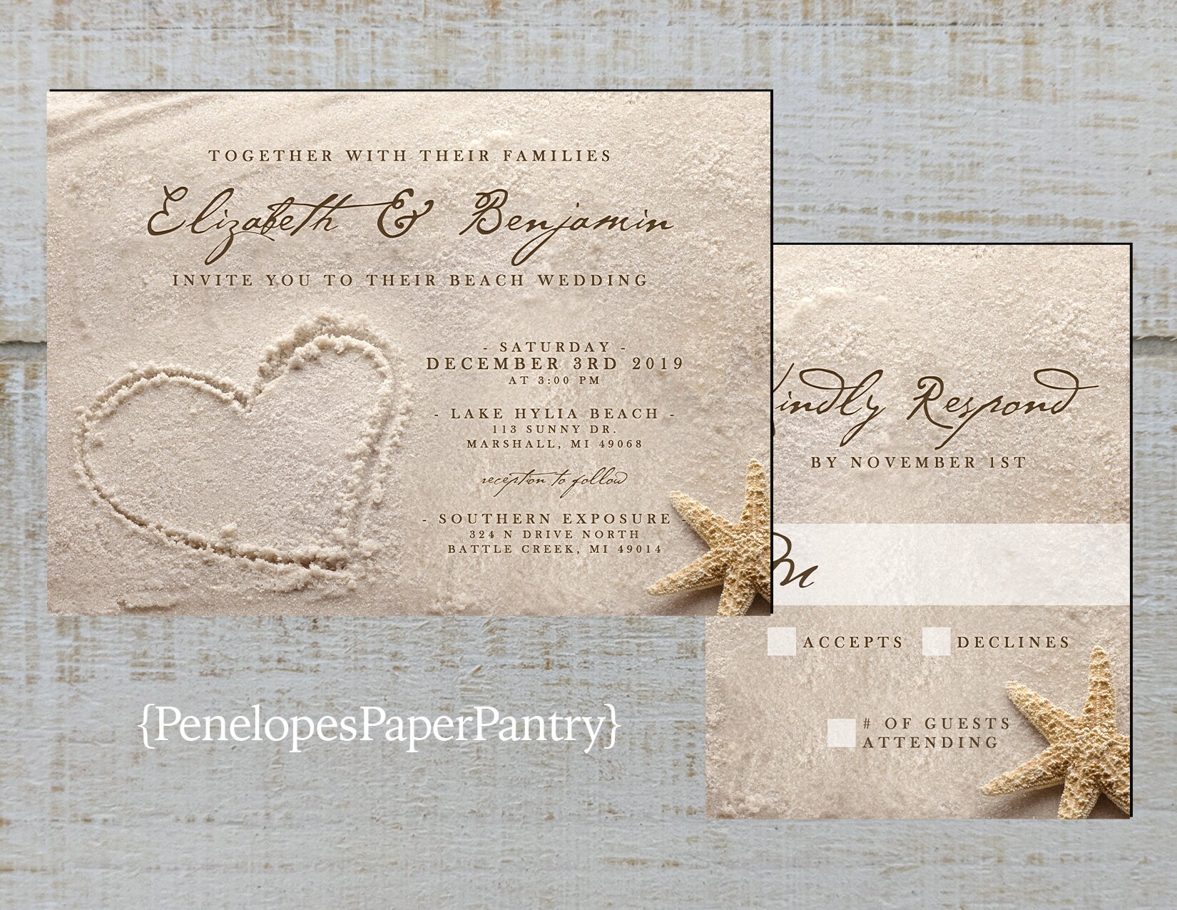 Romantic Beach Wedding Invitation Heart In The Sand Sandy Beach Starfish Destination Wedding Hawaii Wedding Printed Invitation Wedding Set