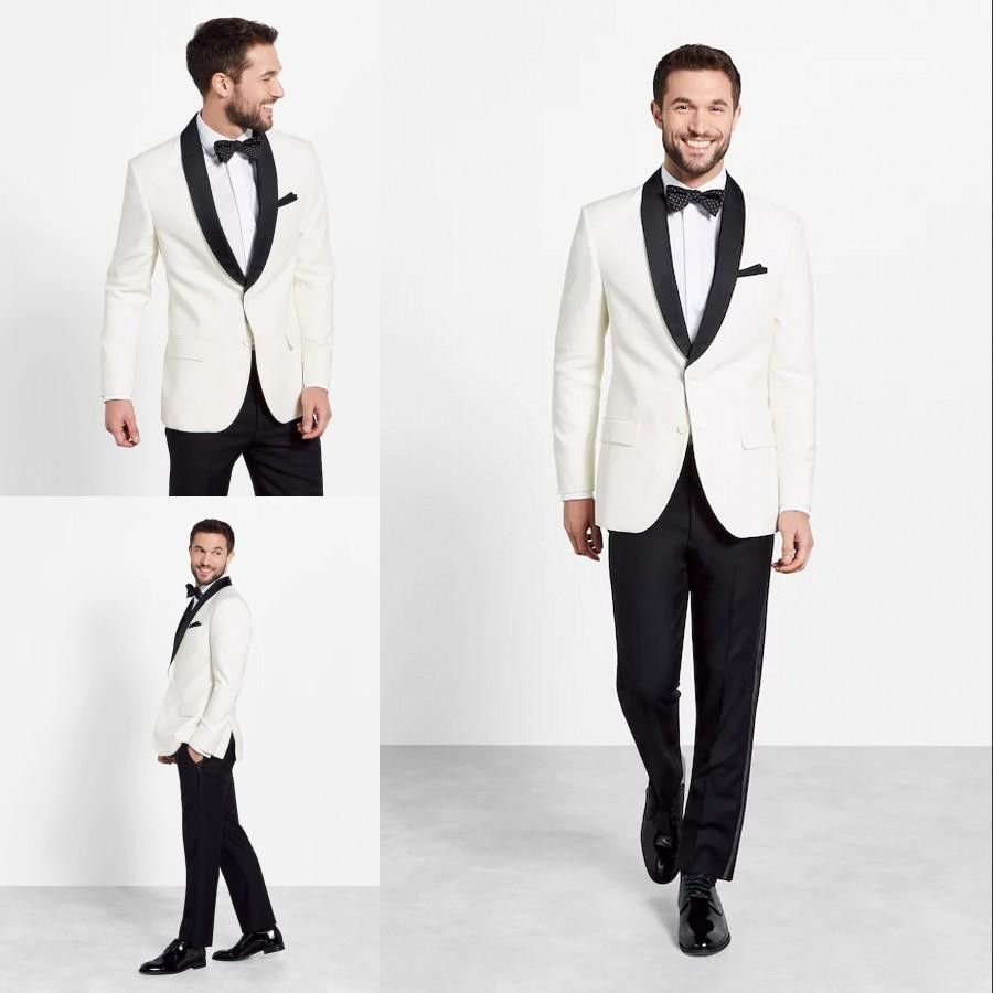 Custom Made Cheap Ivory Wedding Suits For Men 2018 Slim Fit Grooms Tuxedos Two Pieces Men Party Suits Jacket Pants Tie White Tux With Black Black