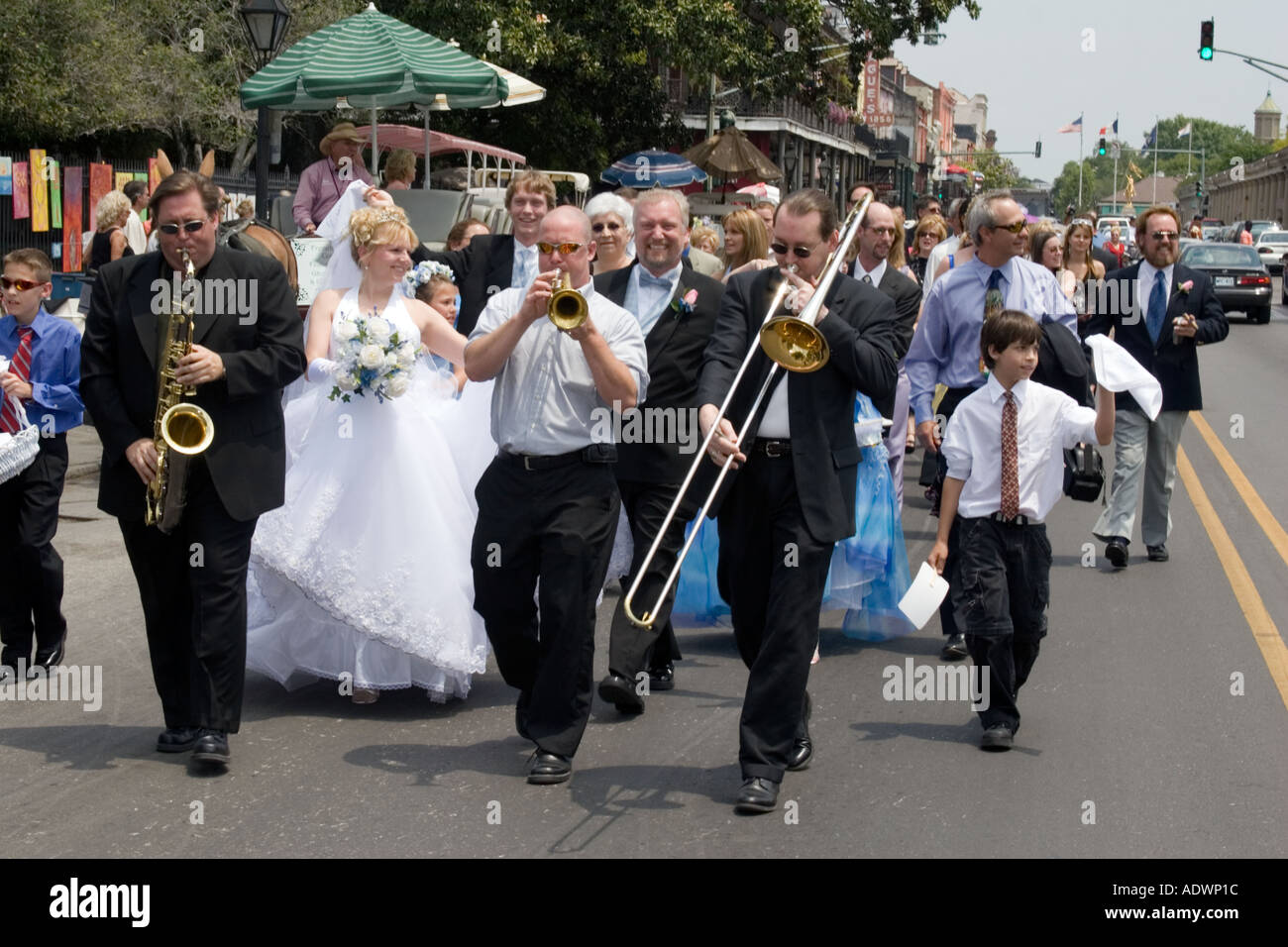 Musicians Lead A Wedding Parade Down A Street In New Orleans Stock