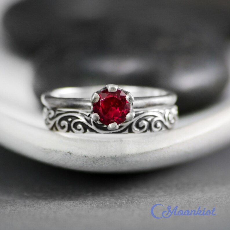 Vintage Style Wedding Ring Set Sterling Silver Proposal Ring Set Ruby Engagement Ring And Wedding Band Ruby Ring Set Valentines Gift