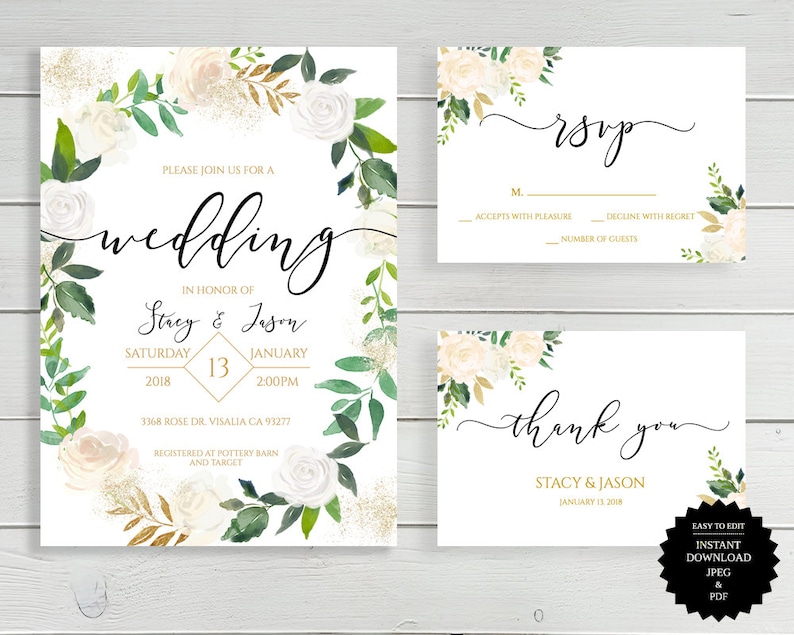 White Floral Wedding Invitation White Gold Green Floral Wedding Invitation Boho Wedding Greenery Wedding Invite Floral Wedding Invite
