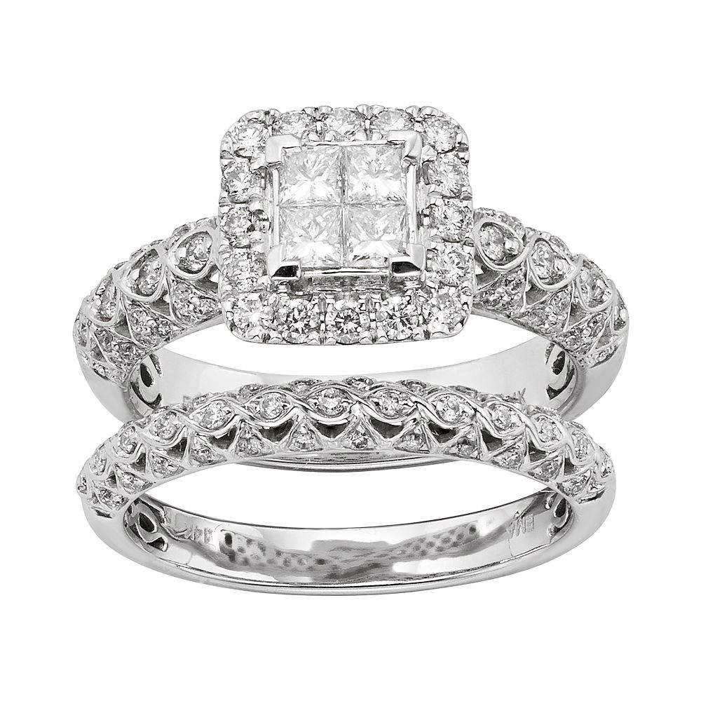 86 Ct T W Diamond Bridal Set Square Halo Engagement And Wedding Rings In 14kt White Gold