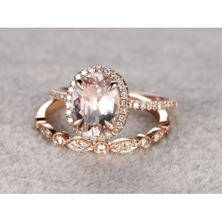 Huge 3 Carat Art Deco Oval Cut Morganite And Diamond Wedding Ring Set In Rose Gold