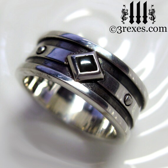 Silver Wedding Ring Black Onyx Mens Engagement Band Moorish Gothic One Stone Size 10 5