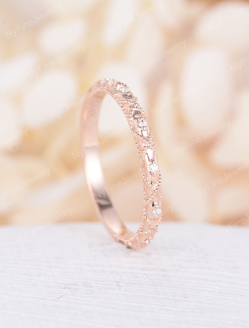 Rose Gold Wedding Band Women Vintage Art Deco Half Eternity Band Antique Stacking Matching Unique Floral Bridal Set Milgrain Promise Gift